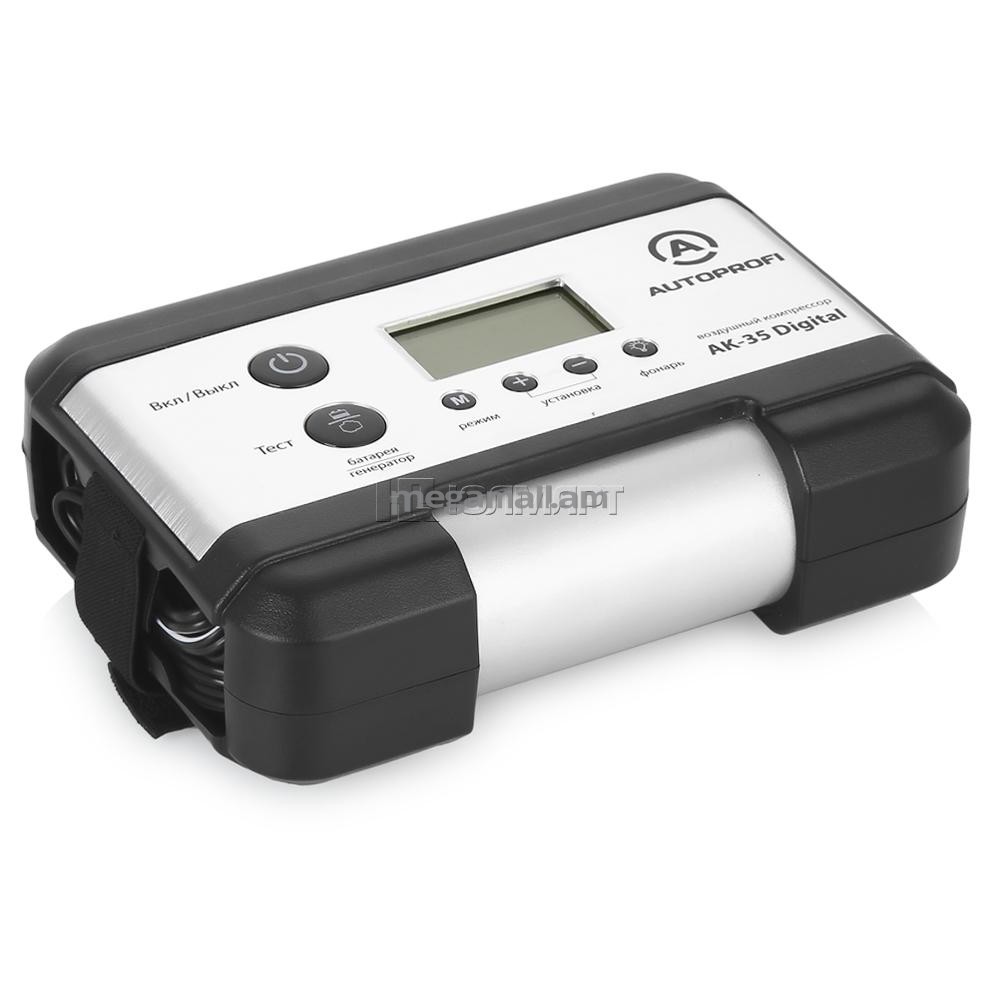 Прибор AK-35 Digital больше, чем компрессор. Помимо накачивания шин он может протестировать аккумулятор и генератор, а также имеет встроенный фонарик с двумя режимами работы. Необходимый уровень давления, по достижению которого компрессор отключается, выставляется вручную. Тест генератора или АКБ начинается после подключения и нажатия одной кнопки. Все значения выводятся на ЖК-экран. В комплекте поставляются переходники для накачивания велосипедных шин, матрацев, мячей и других резиновых изделий.Прибор AK-35 Digital больше, чем компрессор. Помимо накачивания шин он может протестировать аккумулятор и генератор, а также имеет встроенный фонарик с двумя режимами работы. Необходимый уровень давления, по достижению которого компрессор отключается, выставляется вручную. Тест генератора или АКБ начинается после подключения и нажатия одной кнопки. Все значения выводятся на ЖК-экран. В комплекте поставляются переходники для накачивания велосипедных шин, матрацев, мячей и других резиновых изделий.