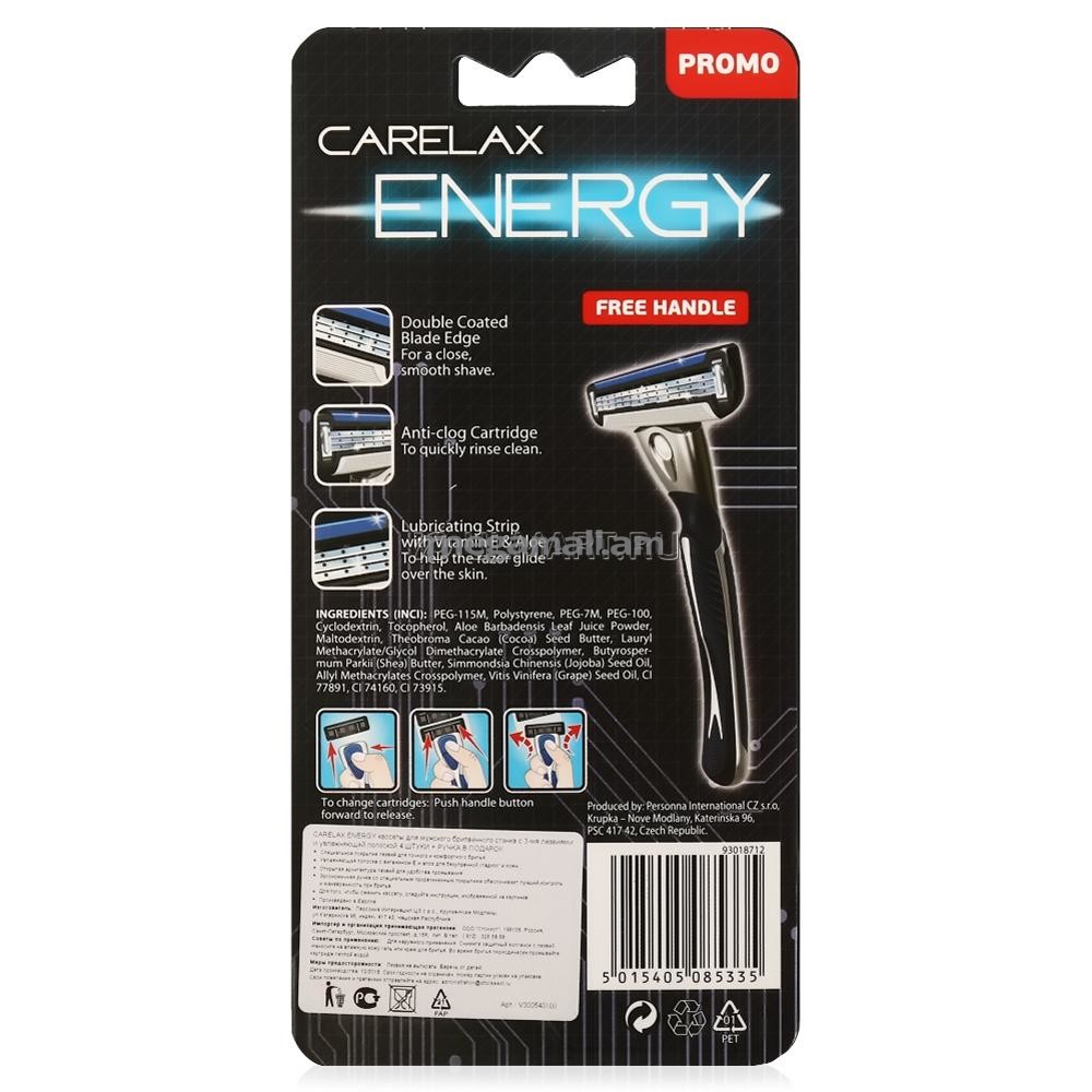 Бритва Carelax Energy с 4 сменными кассетами - это высокотехнологичный инструмент, который подарит максимальное удобство и великолепный результат бритья. Бритвенная система имеет три лезвиями со специальным покрытием, обеспечивающим более точное и комфортное бритье, а увлажняющая полоска с витамином Е и алоэ гарантирует безупречную гладкость кожи. Эргономичная ручка со специальным прорезиненным покрытием обеспечивает лучший контроль и маневренность при бритье, открытая архитектура лезвий удобна для промывания.