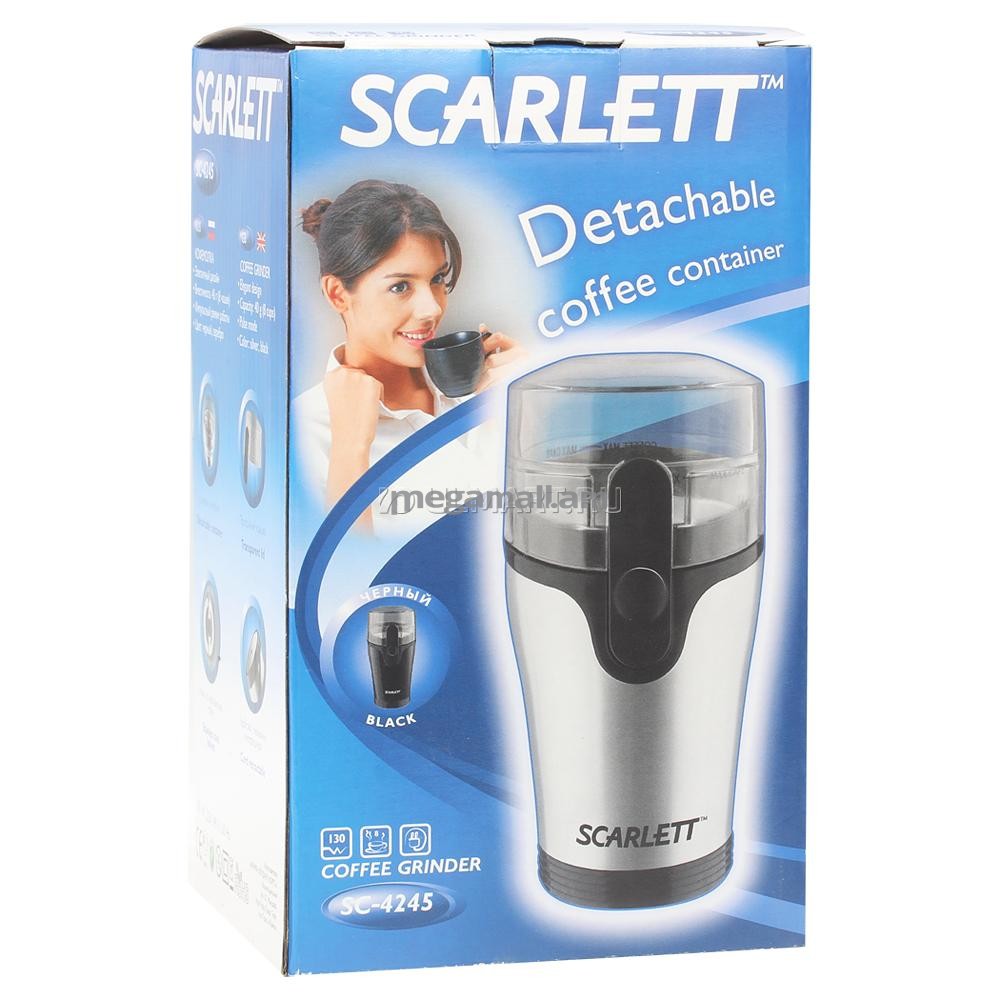 Электрическая кофемолка Scarlett SC-4245 со съемным контейнером для кофе имеет мощность 130 Вт и удобное управление, что позволяет сделать процесс помола быстрым и легким, а прозрачная крышка позволит наблюдать за процессом, контролируя степень помола. Кофемолка обладает приятным, современным дизайном и небольшими размерами, благодаря чему станет настоящим украшением на вашей кухне.Электрическая кофемолка Scarlett SC-4245 со съемным контейнером для кофе имеет мощность 130 Вт и удобное управление, что позволяет сделать процесс помола быстрым и легким, а прозрачная крышка позволит наблюдать за процессом, контролируя степень помола. Кофемолка обладает приятным, современным дизайном и небольшими размерами, благодаря чему станет настоящим украшением на вашей кухне.