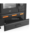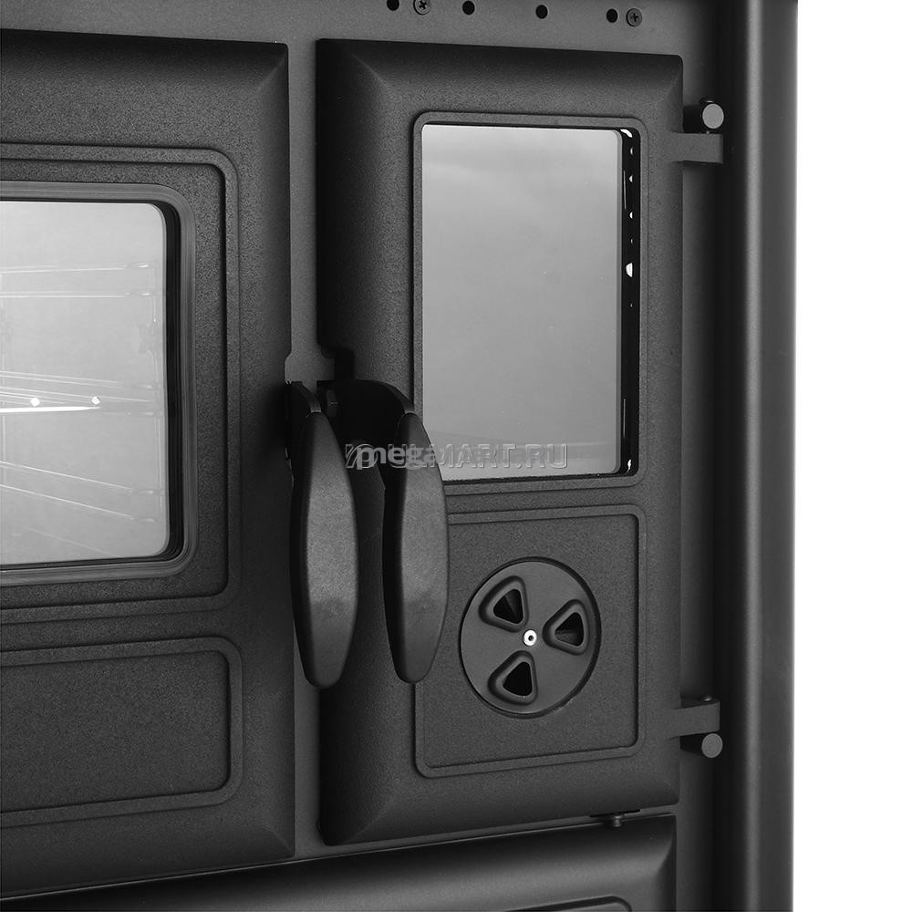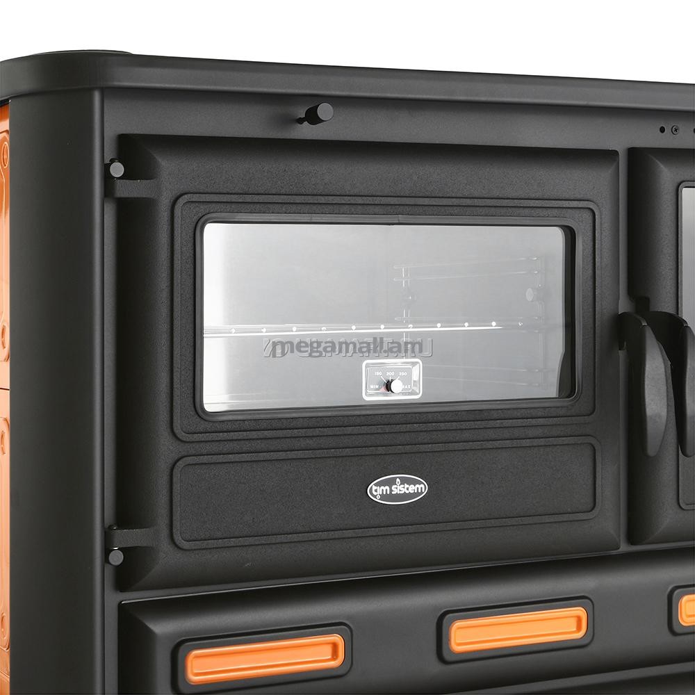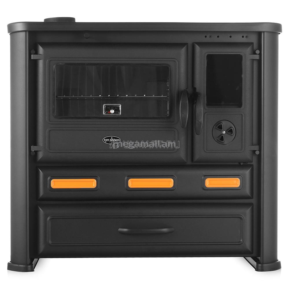 Печь дровяная Tim Sistem Alma Mons L - это кухонная печь, работающая на дровах. Она предназначена для приготовления различных блюд на плите или в духовке, а так же идеально справится с обогревом помещения площадью до 40 кв. м. Ее корпус изготовлен из тонколистовой стали и покрыт термостойкой краской, а внутренние вермикулитовые плиты печи, выдерживают термические нагрузки до 1200°С. Дверца топочной камеры изготовлена из серого чугуна и застеклена стеклокерамикой, способной выдерживать температуру до 750°С. В местах соприкосновения с корпусом и стеклом использован уплотнительный шнур. Дверца закрывается герметично, благодаря массивной ручке с прижимным замком. Над дверцей топки имеется регулировка подачи воздуха на стекло. Система позволяет стеклу оставаться чистым. Колосниковая решётка выполнена из чугуна и имеет подвижный механизм для стряхивания золы. Зольный ящик спрятан за чугунной дверцей с регулировкой подачи воздуха на колосник. Чистку от золы можно производить не прерывая горения. В нижней части печи имеется вместительный ящик для хранения дров. Подключение к дымоходу производится через чугунный патрубок, расположенный сверху или сзади с левой стороны от топки.