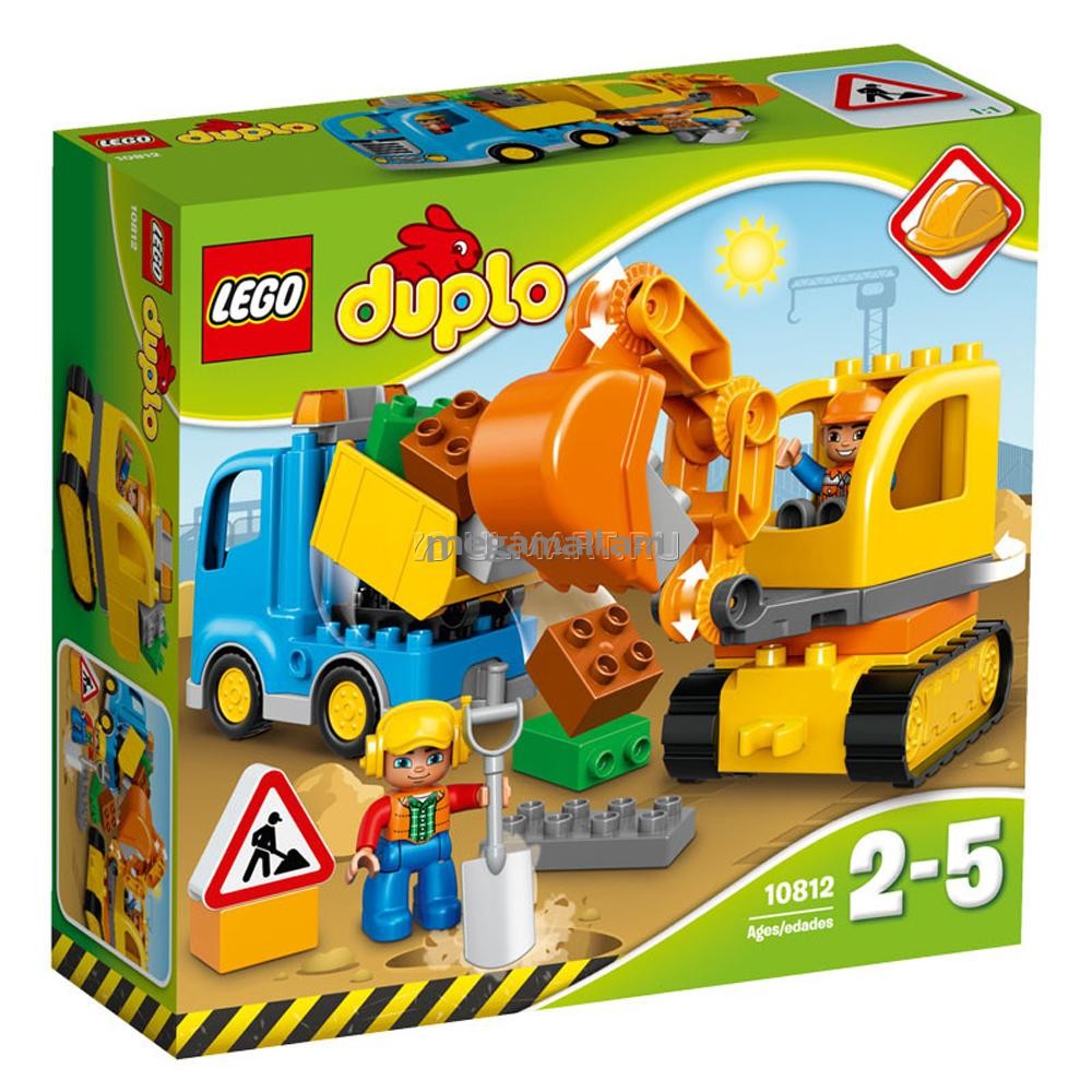 LEGO DUPLO 10812 Грузовик и гусеничный экскаватор сможет заинтересовать Вашего ребенка. Специализированная техника отлично дополнит игрушечную строительную площадку. Дорожный знак просигнализирует жителям о том, что ведутся важные работы по благоустройству, а откидной ковш и вращающаяся кабина экскаватора добавят еще больше реалистичности в игру. Помоги рабочим скорее завершить строительство!