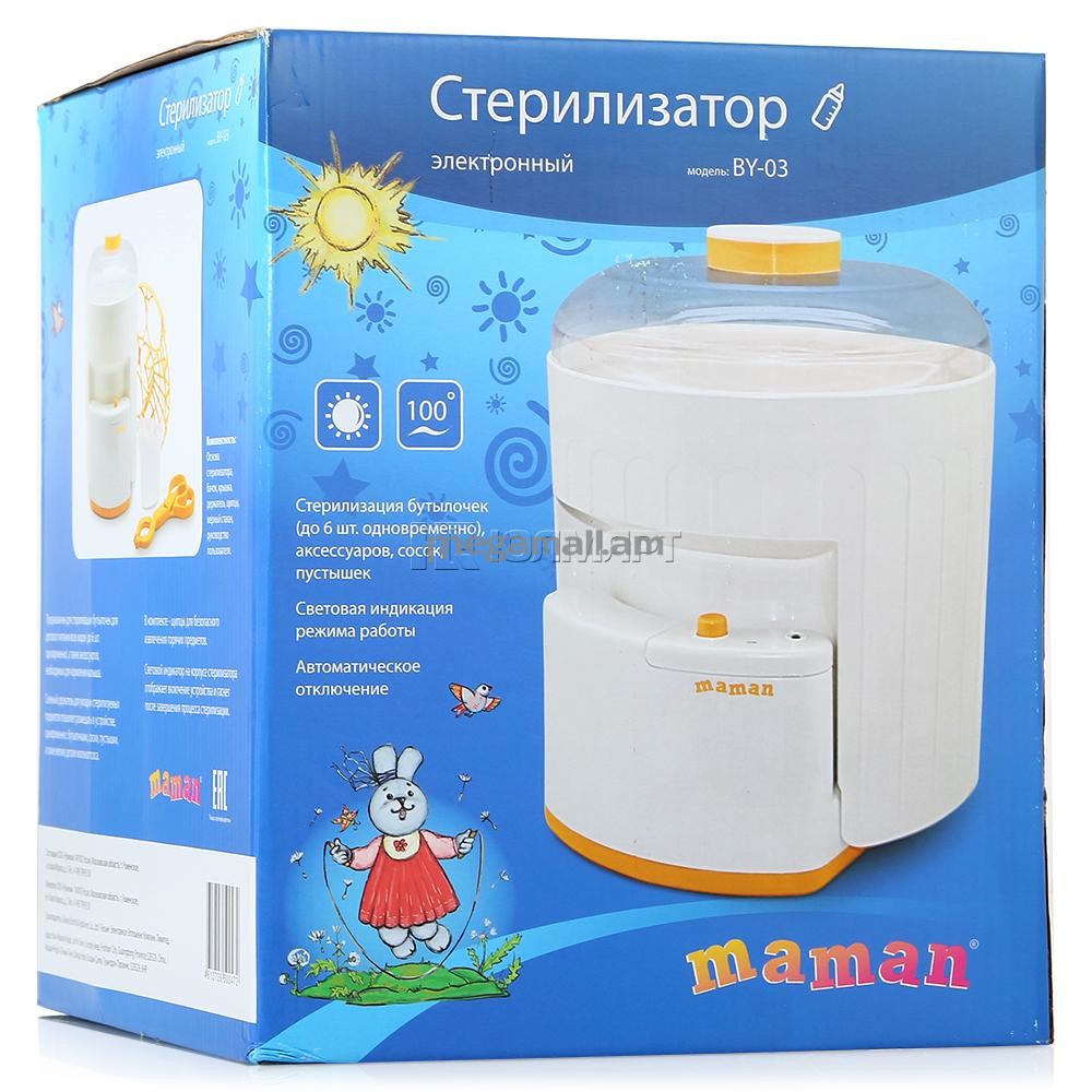 Электронный стерилизатор Maman BY-03 предназначен для стерилизации всех видов бутылочек для детского питания, а также аксессуаров для кормления малыша. Съемный держатель для укладки стерилизуемых предметов позволяет размещать в устройстве, одновременно с бутылочками, соски, пустышки и мелкие детали молокоотсоса. Световой индикатор отображает включение прибора и гаснет после завершения процесса стерилизации.Электронный стерилизатор Maman BY-03 предназначен для стерилизации всех видов бутылочек для детского питания, а также аксессуаров для кормления малыша. Съемный держатель для укладки стерилизуемых предметов позволяет размещать в устройстве, одновременно с бутылочками, соски, пустышки и мелкие детали молокоотсоса. Световой индикатор отображает включение прибора и гаснет после завершения процесса стерилизации.