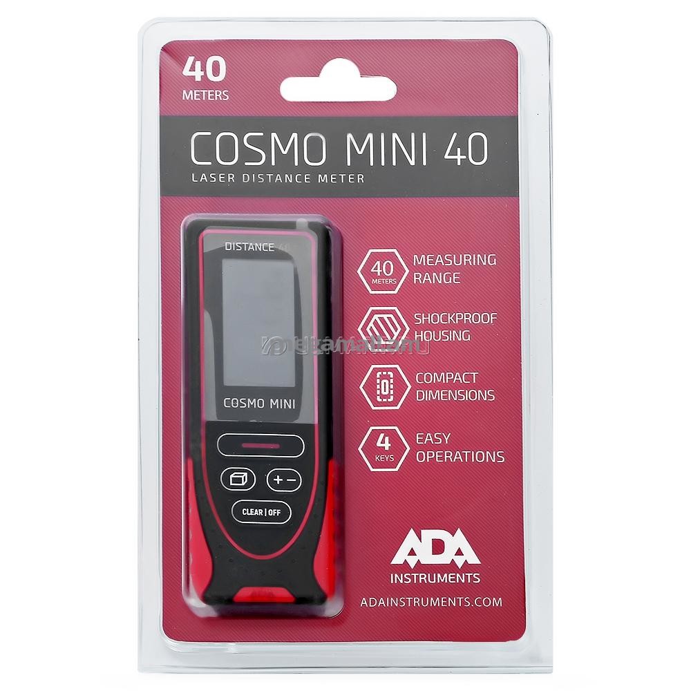 ADA Cosmo Mini 40 - новая компактная модель лазерного дальномера для измерений до 40 метров. Оптимальный дальномер специальной серии COSMO с минимальным набором функций для измерений и расчетов предназначен для измерений дистанций до 40 метров внутри помещений и на улице. Погрешность измерения ±2,0 мм. Все измерения производятся при помощи всего 4 кнопок. Первая - измерение, она же включение и переход в непрерывный режим, вторая кнопка для выбора функций: измерение площади, объема, измерения «по Пифагору». Третья - функция сложения и вычитания. Четвертая - отмена и выключение.