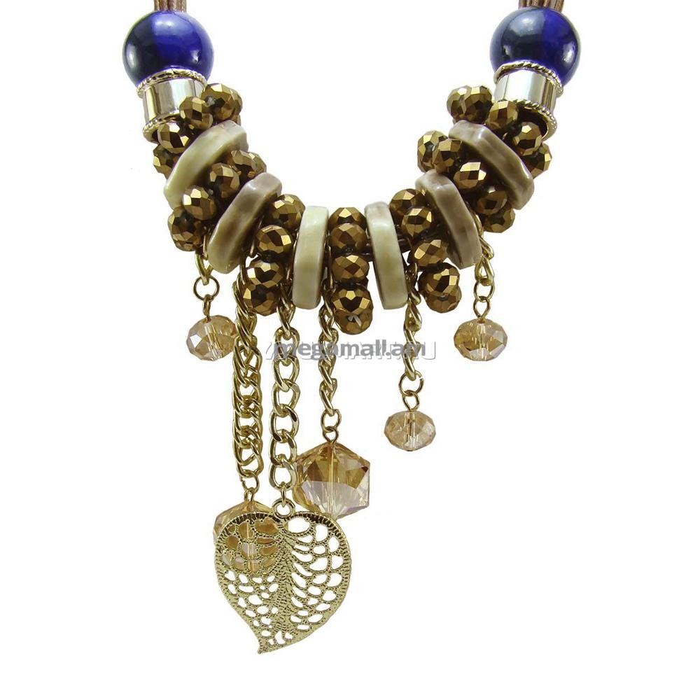 Самобытное колье, выполненное с использованием разнообразных техник и материалов. Многочисленные жгутики собраны в один пучок, на который нанизаны заслуживающие внимания фарфоровые крупные сине-серые бусины, а дальше следует каскад украшений. Соединенные резинкой, ограненные камешки чередуются с керамическими шайбами дымчато-бежевого цвета, на концах подвесок-цепочек сверкают стеклянные камни великолепной огранки, напоминающие желтые топазы, а в центре ожерелья красуется нежный березовый листок.Изысканные украшения «Taya» подчеркнут вашу индивидуальность и безупречный вкус. Серьги, колье, браслеты и кольца украсят любое вечернее платье, дополнят деловой образ или создадут настроение на вечеринке.