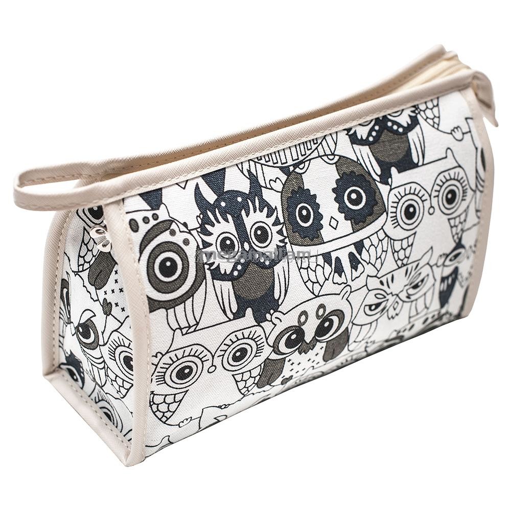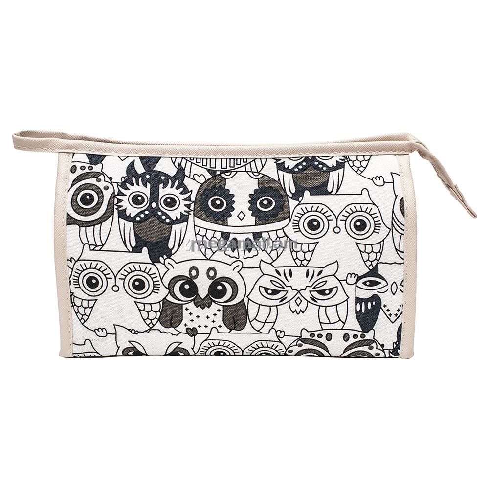 Большая косметичка прямоугольной формы выполнена из ткани с модным морским принтом или анималистической тематикой в виде забавных сов -на выбор. Косметичка очень вместительная и удобная для хранения дамских аксессуаров, снабжена карманом, застегивающимся на молнию. Косметичка изготовлена из натурального льна с добавлением поливолокон.