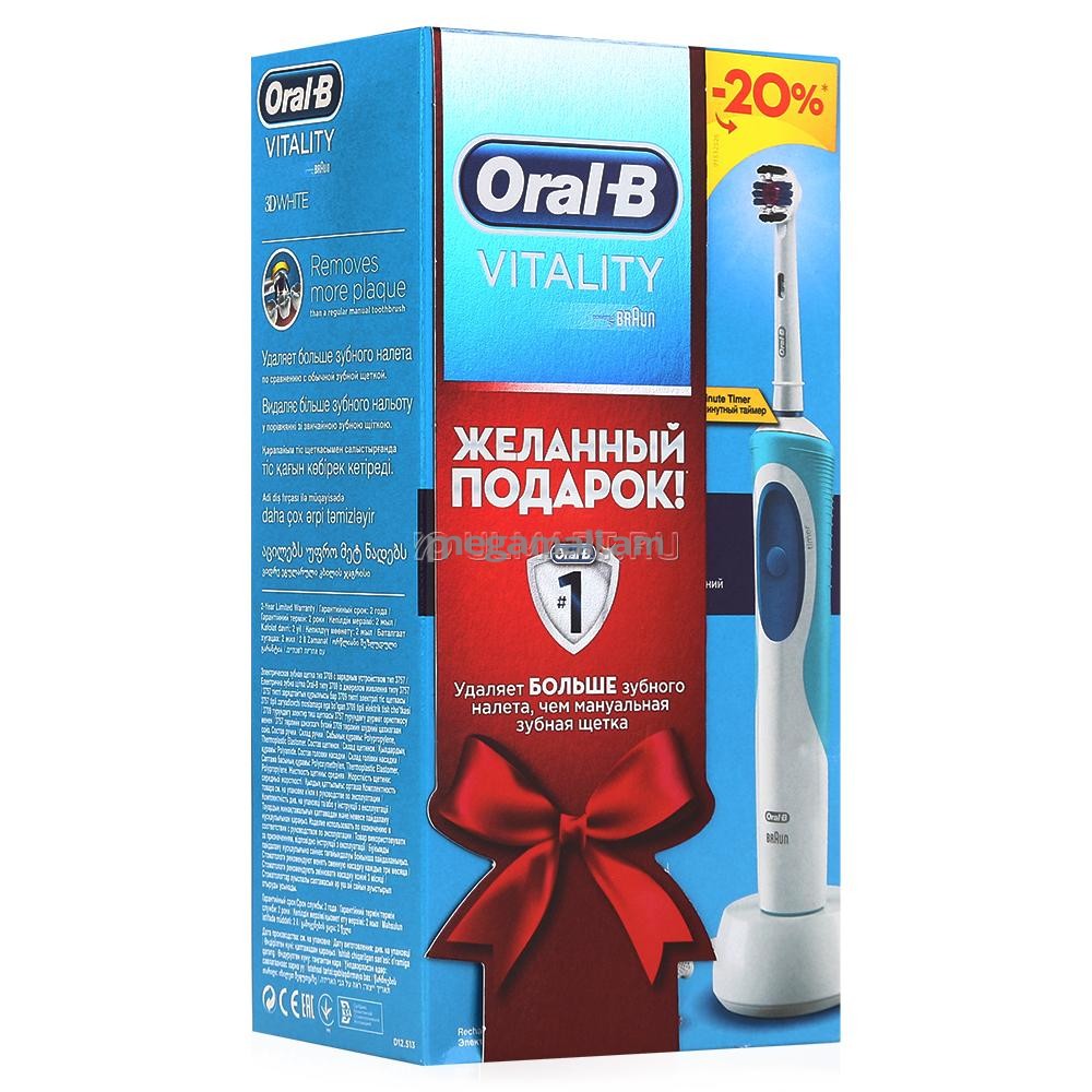 Электрическая зубная щетка Oral-B Vitality 3DW D12.513W удаляет темные пятна на эмали и бережно полирует поверхность зубов. Созданная при поддержке стоматологов полирующая чашечка охватывает каждый зуб для тщательного удаления налета и пятен. Технология 2D Cleaning Action с возвратно-вращательными движениями удаляет налет лучше, чем обычная зубная щетка, а закругленные кончики щетинок обеспечивают безопасность применения. В щетку встроен двухминутный таймер, позволяющий соблюдать рекомендуемое стоматологами для чистки время.
