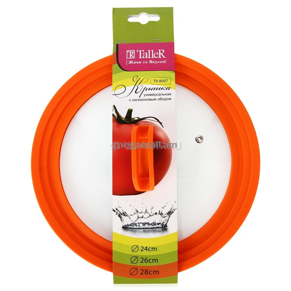 TalleR TR-8007 - это универсальная стеклянная крышка, оснащенная специальным силиконовым ободком для предотвращения появлений царапин на посуде. Ее главное преимущество - возможность использования с посудой разного диаметра (24, 26, 28 см). Данная модель включает в себя паровое отверстие, которое необходимо для качественного приготовления ваших блюд. Благодаря уникальному дизайну ручки, вы сможете разместить лопатку на крышке.