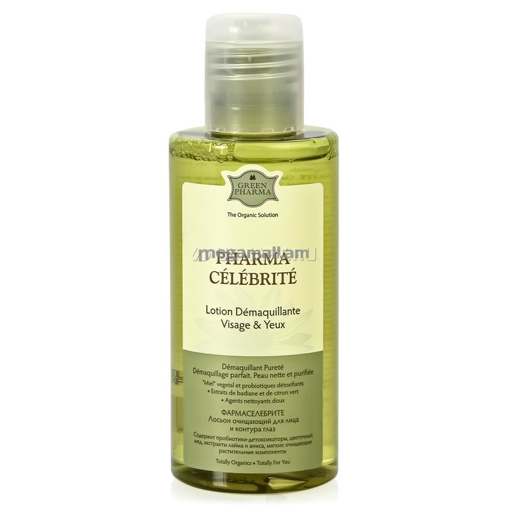 Очищающий лосьон для лица и контура глаз Greenpharma Pharma Celebrite cодержит пробиотики-детоксикаторы, цветочный мед, экстракты лайма и аниса, а также мягкие очищающие растительные компоненты, которые эффективно очищают кожу лица, веки и область вокруг глаз. Растительные экстракты, входящие в состав лосьона, тонизируют, успокаивают кожу и обеспечивают сохранение на ней естественной водно-жировой пленки.