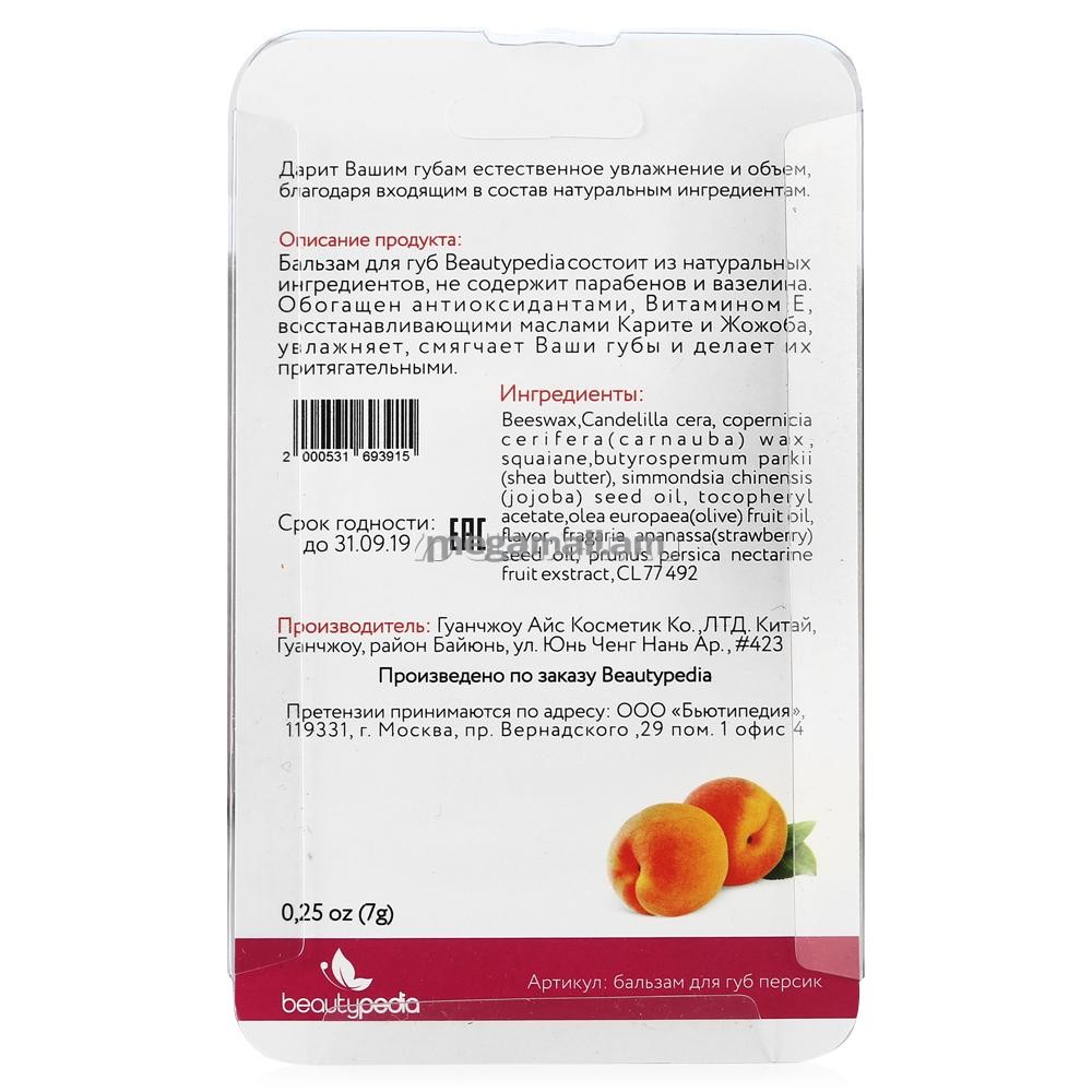 Увлажняющий бальзам Beautypedia «Персик» - это идеальный уход и защита кожи губ в любое время года. Благодаря входящим в состав натуральным ингредиентам продукт придает вашим губам естественное увлажнение и объем. Высокоэффективная формула без парабенов и вазелина, обогащенная антиоксидантами, витамином Е, восстанавливающими маслами карите и жожоба, бережно ухаживает за нежной кожей ваших губ, делая их притягательными и соблазнительными, а легкий, приятный аромат создаст хорошее настроение. Компактные размеры позволяют средству поместиться в любую сумочку, а благодаря необычной форме, вы с легкостью отыщете его в любой момент, что делает бальзам незаменимым спутником на пути к идеальному внешнему виду.