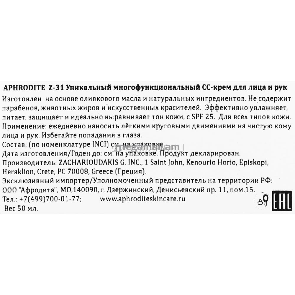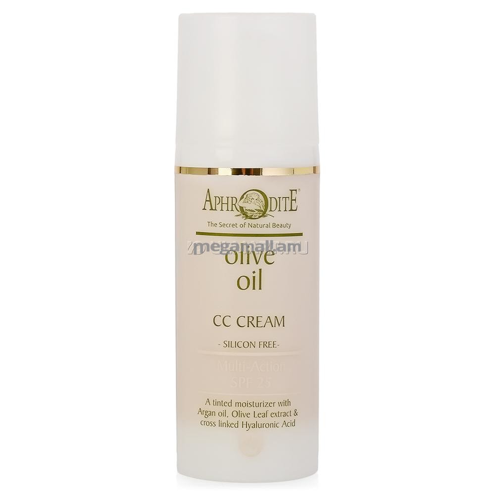 Многофункциональный, защитный CC крем Aphrodite - это универсальное средство, которое подходит для любого типа кожи и сочетает в себе свойства тонального, защитного и омолаживающего ухода. Рецептура крема содержит идеальное сочетание критского органического оливкового масла, гиалуроновой кислоты, масла арганы, экстрактов граната, листьев оливы, витамина Е и полифенолов виноградного сока. Все эти натуральные ингредиенты способствуют повышению естественного уровня влаги в коже, сглаживанию ее недостатков и замедлению процесса старения. Активные экстракты сибирской лиственницы и красных водорослей, а также витамин B3 успокаивают кожу и придают ей здоровый сияющий вид. Еще одним достоинством крема является защита кожи от вредных UVA и UVB-лучей и негативных факторов окружающей среды.