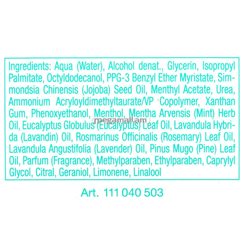 СоставAqua (Water), Alcohol denat., Glycerin, isopropyl Palmitate, Octyldodecanol, PPG-3 Benzyl Ether myristate, Simmondsia, Chinensis (Jojoba) Seed Oil, Menthyl Acetate, Urea, Ammonium Acryloyldimethyltaurate/VP Copolymer, Xanthan Gum, Phenoxyethanol, Menthol, Mentha Arvensis (Mint) Herb Oil, Eucalyptus Globulus (Eucalyptus) Leaf Oil, Lavandula Hybrida (Lavandin) Oil, Rosmarinus Officinalis (Rosmare) Leaf Oil, Lavandula Angustifolia (Lavander) Oil, Pinus Mugo (Pine) Leaf Oil, Parfum (Fragrance), Methylparaben, Ethylparaben, Caprylyl Glycol, Citral, Geraniol, Limonene, Linalool.