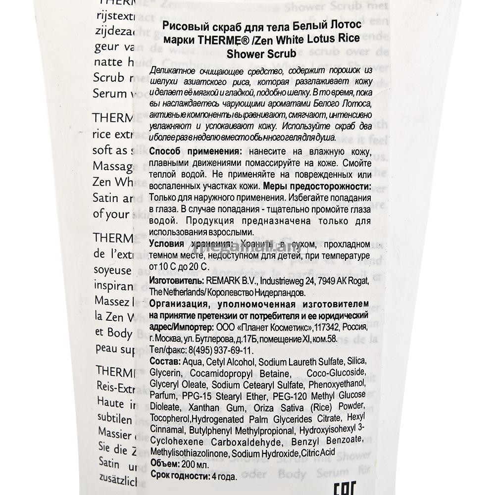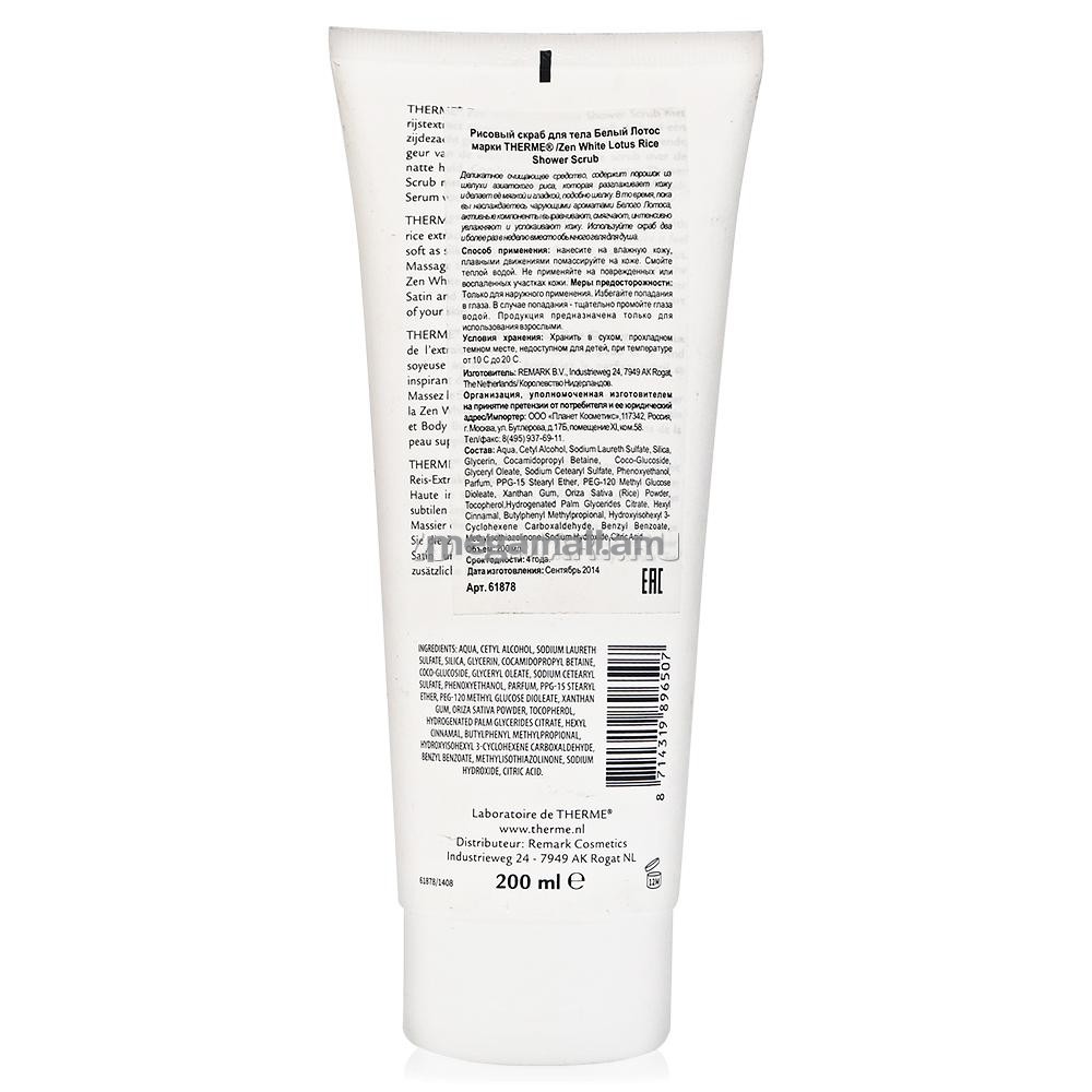 Скраб для тела Therme Zen White Lotus Rice Shower Scrub - это деликатное очищающее средство, содержащее порошок из шелухи азиатского риса, который разглаживает кожу и делает ее более мягкой и гладкой. Пока вы наслаждаетесь чарующими ароматами белого лотоса, активные компоненты в составе скраба выравнивают, смягчают, интенсивно увлажняют и успокаивают кожу. Используйте скраб несколько раз в неделю вместо обычного геля для душа.