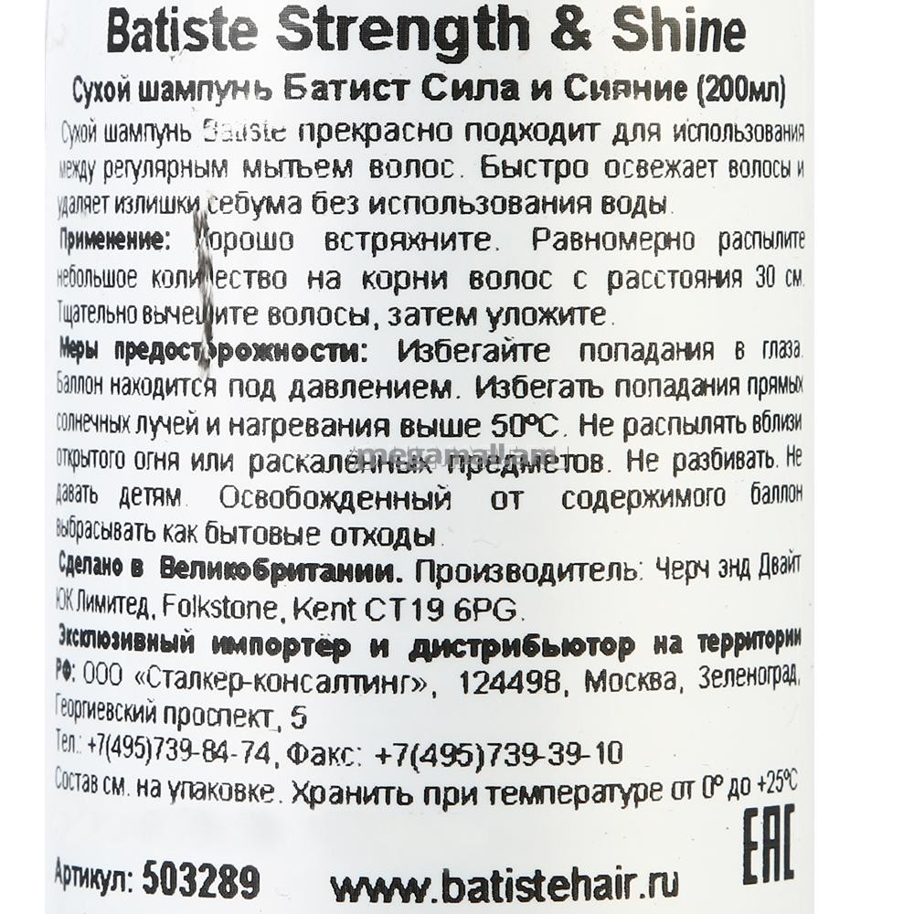 Batiste Strength&Shine - сухой шампунь с L-Аргинином , созданный специально для придания волосам блеска и силы, для структурирования непослушных локонов. Его специальная формула укрепляет, восстанавливает и делает волосы более мягкими. Шампунь станет настоящим спасением для волос во время жары или длительного пребывания в офисе, а также для тех, чьи волосы быстро теряют влагу и становятся сухими.