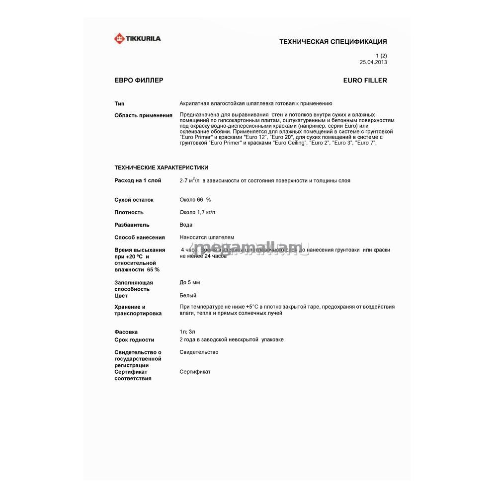 Tikkurila Euro Filler - Водоразбавляемая, готовая к применению влагостойкая шпатлевка для стен и потолков внутри сухих и влажных помещений. Наполняемость составляет 5 мм без растрескивания. Усадка незначительная, обладает хорошей адгезией. Предназначена для выравнивания деревянных, бетонных, оштукатуренных и гипсокартонных поверхностей под окраску воднодисперсионными красками (серии Euro, Harmony, Joker и др.) и для оклеивания обоями.Tikkurila Euro Filler - Водоразбавляемая, готовая к применению влагостойкая шпатлевка для стен и потолков внутри сухих и влажных помещений. Наполняемость составляет 5 мм без растрескивания. Усадка незначительная, обладает хорошей адгезией. Предназначена для выравнивания деревянных, бетонных, оштукатуренных и гипсокартонных поверхностей под окраску воднодисперсионными красками (серии Euro, Harmony, Joker и др.) и для оклеивания обоями.