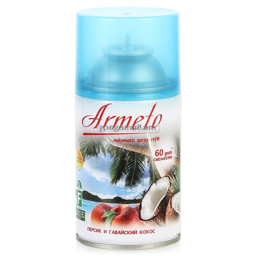 Armeto «Персик и Гавайский Кокос» AR250PK - это сменный баллон, предназначенный для ароматизации воздуха в помещении. Благодаря своей универсальной форме он отлично подойдет для большинства автоматических устройств. Аромат представлен семейством фруктово-цветочных ароматов, микс тропических фруктов: верхние ноты - плод страсти, яблоко и апельсин; ноты сердца - бархатистый персик, мякоть манго и банана, цветы жасмина; ноты шлейфа - кокосовое молочко и аромат древесины кедра на мускусном фоне. Время его действия до 60 дней (зависит от выбранного интервала времени распыления). Объем баллона составляет 250 мл.Armeto «Персик и Гавайский Кокос» AR250PK - это сменный баллон, предназначенный для ароматизации воздуха в помещении. Благодаря своей универсальной форме он отлично подойдет для большинства автоматических устройств. Аромат представлен семейством фруктово-цветочных ароматов, микс тропических фруктов: верхние ноты - плод страсти, яблоко и апельсин; ноты сердца - бархатистый персик, мякоть манго и банана, цветы жасмина; ноты шлейфа - кокосовое молочко и аромат древесины кедра на мускусном фоне. Время его действия до 60 дней (зависит от выбранного интервала времени распыления). Объем баллона составляет 250 мл.