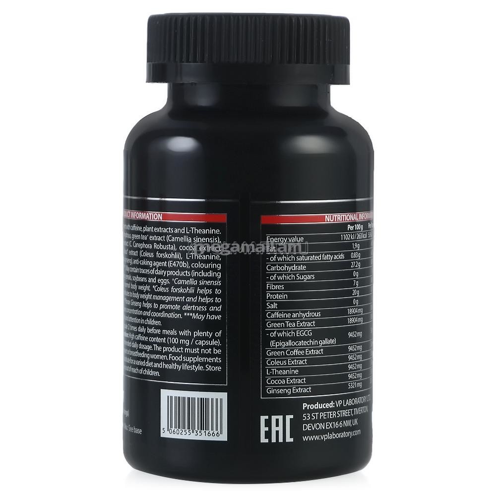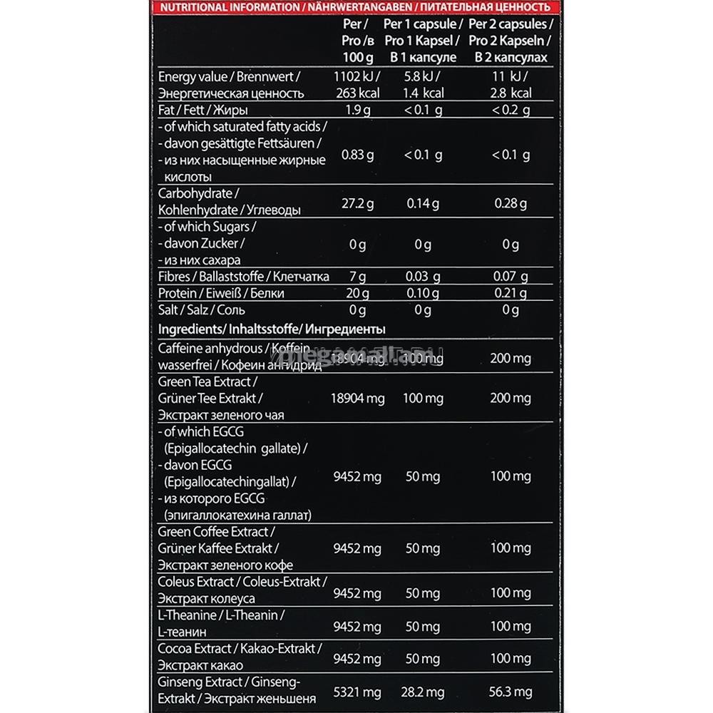 Свойства продуктаЭкстракт зеленого чая и безводный кофеин являются сильнейшими супер-термогенными компонентами и в сочетании с экстрактом колеуса ускорят обмен веществ, а также обеспечат вас взрывной энергией с одной дозы. Экстракт зеленого кофе участвует в метаболизме жиров, а также понижает усвоение глюкозы, что поможет нормализовать уровень сахара в крови и уменьшить количество перекусов.