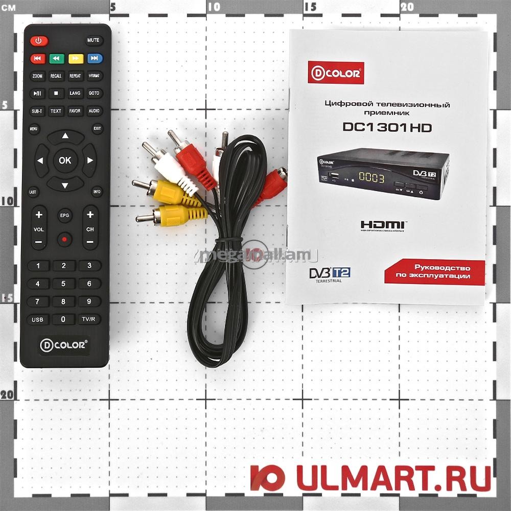 Цифровая приставка D-Color DC1301HD предназначена для приема и декодирования сигналов наземного телевизионного вещания в стандарте DVB-T2 и последующего вывода видео и аудио сигнала на аналоговый телевизионный приемник. Приставка оснащена дисплеем, в комплекте пульт ДУ (батарейки в комплекте) и кабель RCA. Выполнена в чёрном металлическом корпусе.