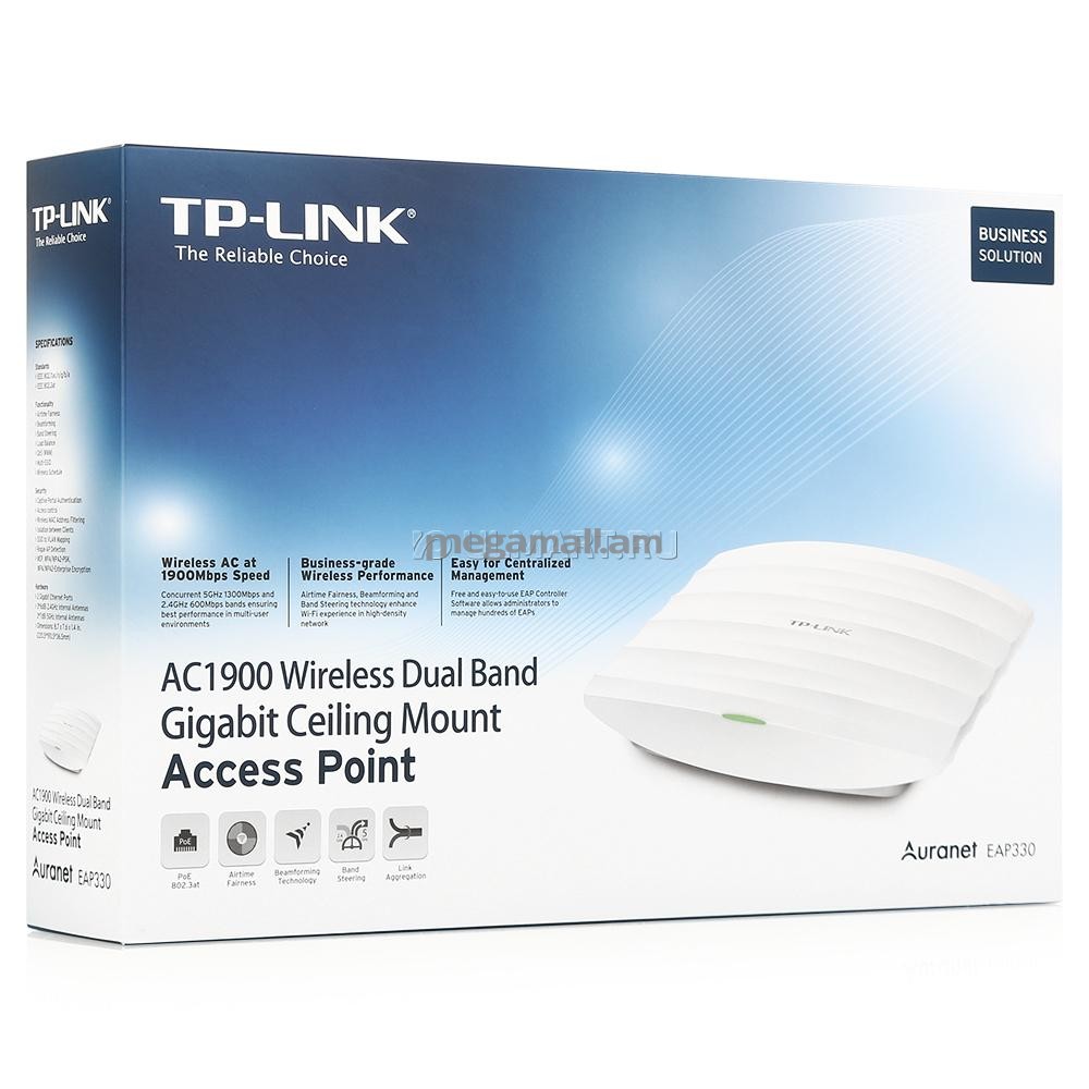 Точка доступа для бизнеса EAP330 от компании TP-LINK представляет собой удобное в управлении и простое в размещении беспроводное решение с надёжной защитой. Устройство обладает удобным дизайном для лёгкой установки на стене или на потолке. Настройки WLAN и управление упрощены благодаря централизованной веб-утилите настройки. Дизайн устройства позволит ему сочетаться с большинством интерьеров. Благодаря высокой скорости стандарта 11AC, производительному Wi-Fi, эффективному порталу аутентификации, низкопрофильному дизайну и поддержке PoE, устройство EAP330 способно обеспечить работу в загруженной пользовательской среде, включая школы, отели и предприятия.