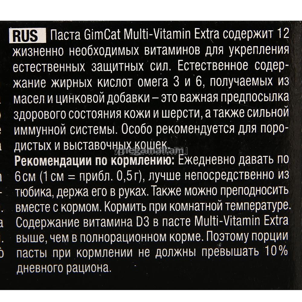 Паста GimCat Multi-Vitamin Extra содержит 12 жизненно необходимых витаминов для укрепления естественных защитных сил. Естественное содержание жирных кислот омега 3 и 6, получаемых из масел и цинковой добавки - это важная предпосылка здорового состояния кожи и шерсти, а также сильной иммунной системы. Особо рекомендуется для породистых и выставочных кошек.Паста GimCat Multi-Vitamin Extra содержит 12 жизненно необходимых витаминов для укрепления естественных защитных сил. Естественное содержание жирных кислот омега 3 и 6, получаемых из масел и цинковой добавки - это важная предпосылка здорового состояния кожи и шерсти, а также сильной иммунной системы. Особо рекомендуется для породистых и выставочных кошек.